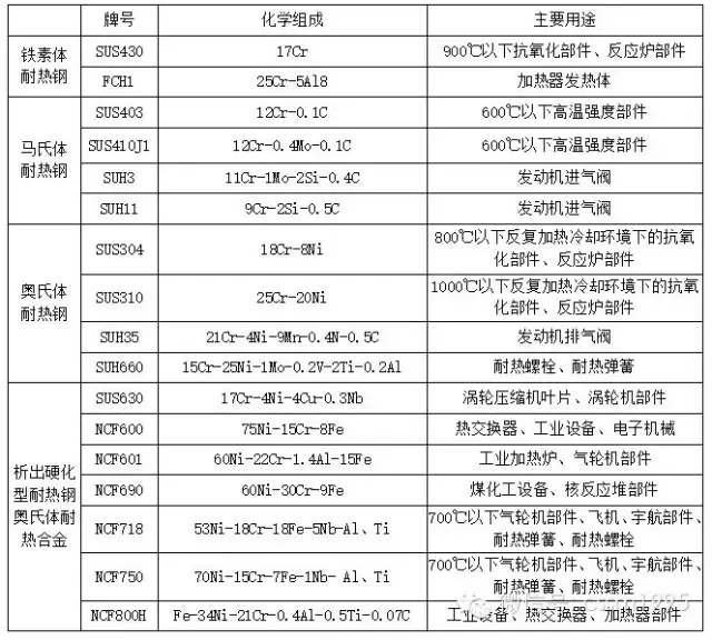 表1 耐熱鋼和耐熱合金的化學組成和主要用途